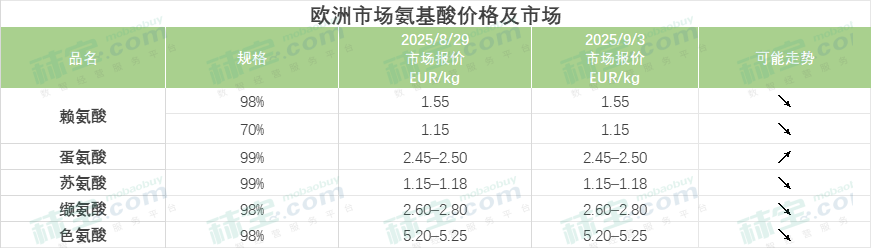 中国氨基酸市场赖氨酸、蛋氨酸、苏氨酸厂家报价持稳,缬氨酸、色氨酸主流报价偏弱。终端用户需求一般,观望居多,谨慎按需采买。赖氨酸市场98%赖氨酸止跌企稳,询单稍显活跃,带动成交略微好转。苏氨酸市场主流厂家报价暂稳,下游用户维持刚需补货,整体成交一般。蛋氨酸市场厂家报价暂稳,终端维持按需采购,实际签单价偏低。缬氨酸市场厂家报价延续弱势,下游用户需求未见明显改善,市场供应充足下整体成交一般。色氨酸市场厂家报价继续偏弱,终端补库情绪不高,厂家销售压力大,市场成交清淡。