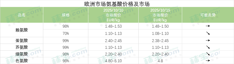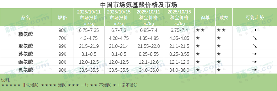 赖氨酸:主流厂家报价分化,当前发货为主,下游维持按需补库,实际成交有限。据市场消息称,10月13日,金玉锋98.5%赖氨酸报价6400元/吨,70%赖氨酸报价4300元/吨。后续需关注厂家报价变化和80%赖氨酸市场供应情况。预计短期内98%赖氨酸盐酸盐价格或保持弱稳,70%赖氨酸硫酸盐价格或小幅下跌。
