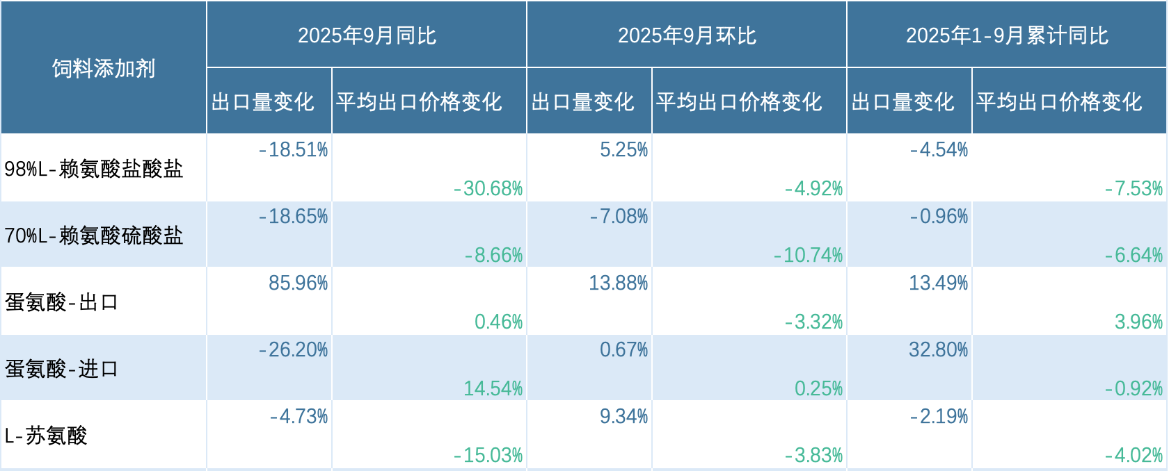 根据国家海关总署2025年9月公布的数据统计分析,2025年1-9月98%赖氨酸盐酸盐和70%赖氨酸硫酸盐累计出口分别下降4.54%和0.96%,9月份出口同比分别下降18.51%和18.65%,同比降幅较大主因是受反倾销政策推动,2024年9月赖氨酸出口量大增。但是,9月份98%赖氨酸出口环比情况好转,环比增长5.25%,70%赖氨酸反而环比下降7.08%,98%赖氨酸和70%赖氨酸平均出口价格环比分别下降4.92%和10.74%。9月份,蛋氨酸无论是同比还是环比都大幅增长,而进口却持平或有所下降,市场价格或许可以得到稍许支撑。