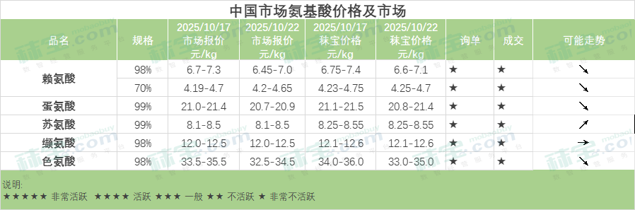 中国氨基酸市场赖氨酸、蛋氨酸、色氨酸主流报价略降,苏氨酸厂家报价略涨,缬氨酸有部分厂家停报。整体市场购销情绪一般,下游用户保持谨慎观望,随用随采。赖氨酸市场弱势运行,随着80%赖氨酸陆续投放市场及新上市玉米价格偏低,终端询单补货不积极,以随用随采为主。苏氨酸市场主流厂家为刺激成交小幅上调报价,终端消化前期库存为主,少量按需补货。蛋氨酸市场厂家报价弱稳,下游用户需求疲软,询单交投不积极,实际签单价格偏低。缬氨酸市场有厂家停报,下游用户询单较少,整体购销氛围清淡。色氨酸市场厂家报价下调,终端保持刚需补货,议价成交为主。