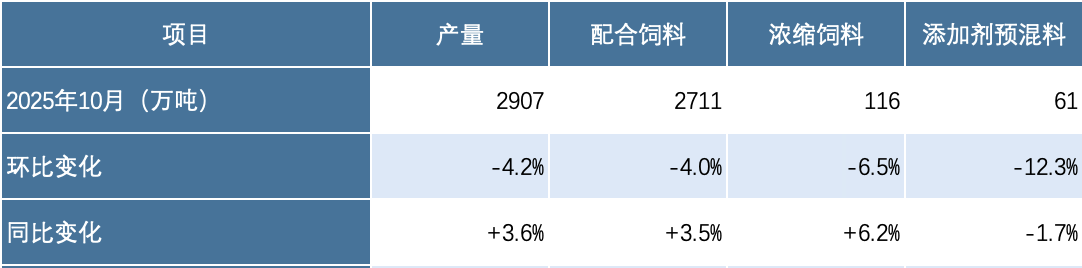 2025年10月,全国工业饲料产量2907万吨,环比减少4.2%,同比增长3.6%。其中,配合饲料、浓缩饲料同比分别增长3.5%、6.2%,添加剂预混合饲料同比下降1.7%。主要饲料产品出厂价格同比下降,畜禽配合饲料、浓缩饲料、添加剂预混合饲料出厂价格环比以降为主。饲料企业生产的配合饲料中玉米用量占比为38.0%,同比下降2.7个百分点;配合饲料和浓缩饲料中豆粕用量占比为13.9%,环比下降0.4个百分点。
