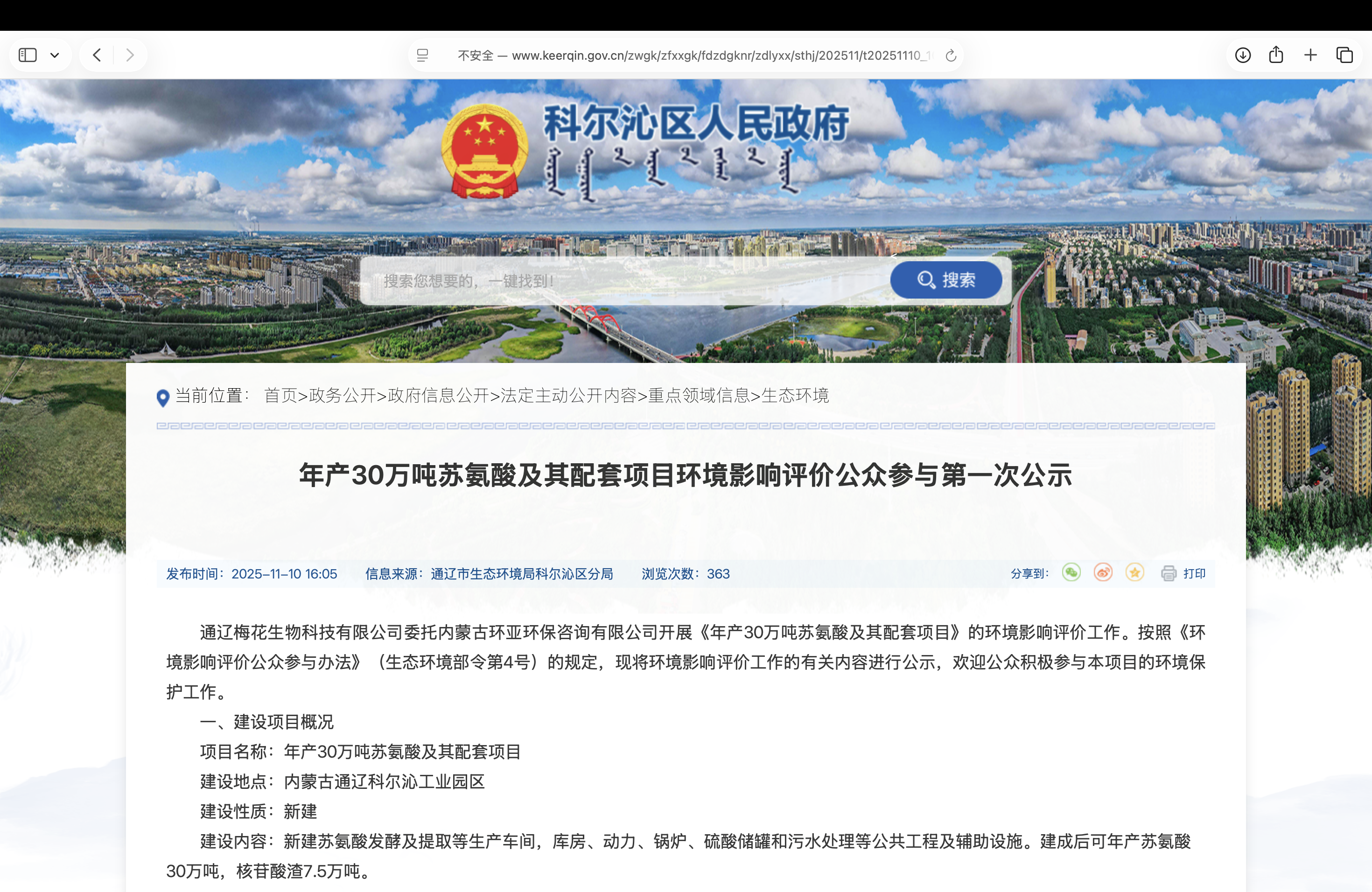 通辽梅花生物发布30万吨苏氨酸项目第一次环评公示