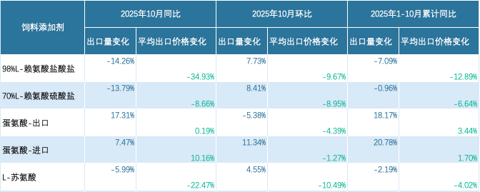根据国家海关总署近期公布的数据统计分析,2025年1-10月苏氨酸累计出口同比降低2.19%,2025年10月出口同比下降5.99%,但环比增加4.55%。2025年1-10月份98%赖氨酸盐酸盐和70%赖氨酸硫酸盐累计出口分别下降7.09%和0.96%,但出口情况持续好转,2025年10月份出口环比分别增长7.73%和8.41%。2025年10月,蛋氨酸出口同比增加17.31%,环比下降5.38%,2025年1-10月累计出口同比增加18.17%,与此同时,10月份进口量同比增加7.47%,环比增加11.34%,1-10月累计进口量同比增加20.78%。在出口价格方面,除了蛋氨酸的平均出口价格和进口价格有不同程度提高之外,其他所有氨基酸出口价格都普遍下降。