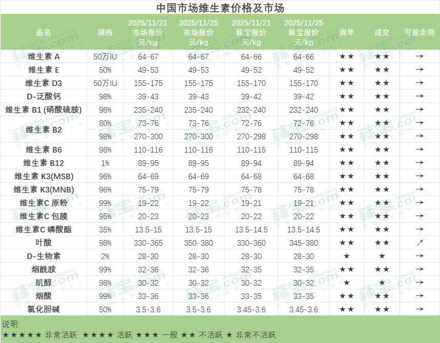 中国维生素市场大部分产品价格保持稳定,下游观望氛围浓厚,谨慎按需购买。维生素A主流厂家维持停报停签,发前期订单为主,价格行情稳中略弱运行。维生素E市场消化库存,价格维持稳定。叶酸部分主流厂家停报停签,部分厂家报价上调,市场价格持续上行。其他维生素品类价格持稳,相应购销氛围清淡。据海关数据统计,2025年10月我国维生素出口总量约3.519万吨,环比增加6.33%,同比减少0.13%。
