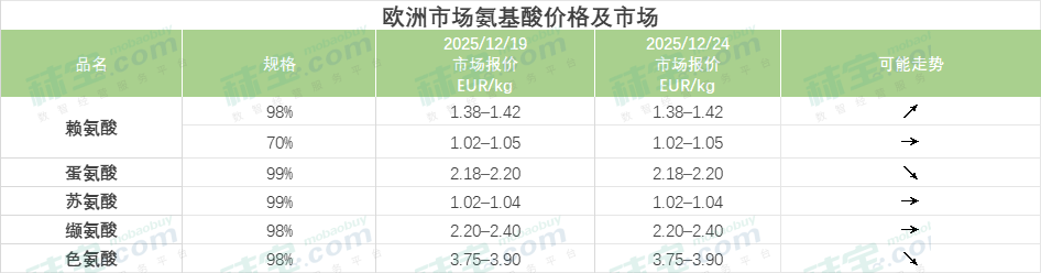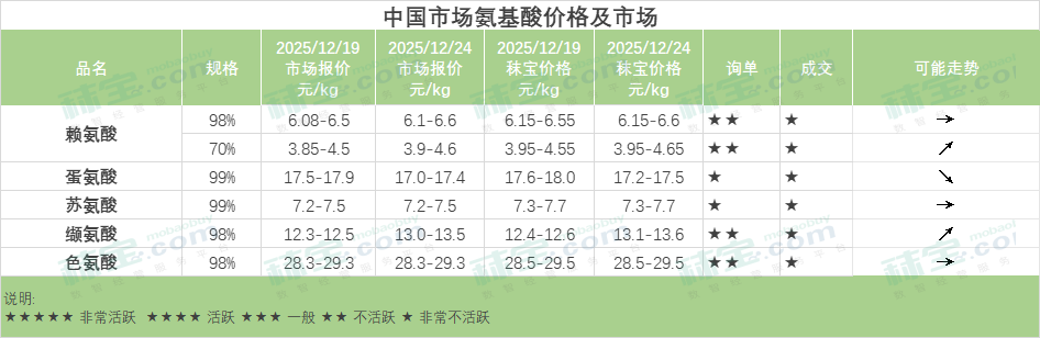 中国氨基酸市场蛋氨酸厂家报价略微下调,其他品类主流报价暂时持稳。赖氨酸市场厂家优先履行当前订单,下游用户保持随用随采,等待头部厂家月底最新报价。蛋氨酸市场厂家持续移库,贸易渠道价格持续下跌,终端零星少量补货。苏氨酸市场暂稳运行,终端观望情绪浓厚,询单交投不积极。缬氨酸市场厂家出口签单好转,当前以发货为主,下游询单成交节奏放缓。色氨酸市场下游用户需求一般,按需议价成交为主。