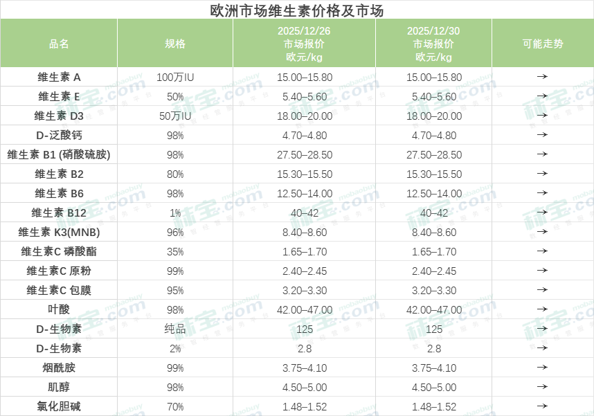 临近元旦,中国维生素市场观望为主,实际成交有限,总体报价持稳。维生素A主流厂家执行前期订单为主,下游需求清淡,市场暂稳运行。维生素E有主流工厂提高报价,市场关注升温,下游采购心态谨慎,市场价格坚挺。维生素D3下游需求不佳,询单成交寂寥,价格偏弱运行。维生素C、泛酸钙市场成交偏淡,价格稳中略弱。VB1和VB6市场价格小幅调整运行。