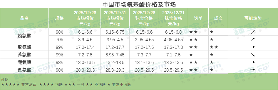 中国氨基酸市场赖氨酸、蛋氨酸主流报价小幅上调,苏氨酸厂家报价弱势,其他品类主流报价暂时持稳。赖氨酸市场厂家优先履行当前订单,下游用户节前补货意愿一般,保持随用随采。蛋氨酸工厂签单价格略有上调,市场询单增加。苏氨酸市场出口放缓,终端观望情绪浓厚,询单交投不积极。缬氨酸市场暂稳运行,厂家当前以发货为主,下游用户少量补货。色氨酸市场下游用户需求一般,按需议价成交为主。