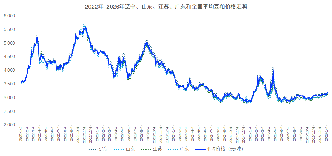 - 库存高位:截至1月初,国内港口进口大豆库存超过700万吨,油厂豆粕库存进一步攀升至116.76万吨,同比增幅高达43%。下游饲料企业采购谨慎,物理库存维持在9.45天左右,普遍采取“随用随采”策略,需求无法有效消化供应。