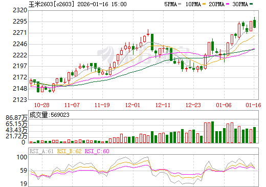 - 大连玉米期货主力C2603合约本周表现强势,呈现“突破上扬”态势。周四(1月15日)盘中最高触及2296元/吨,刷新近一个月高位,最终周五收于2281元/吨,全周环比略涨0.79%。