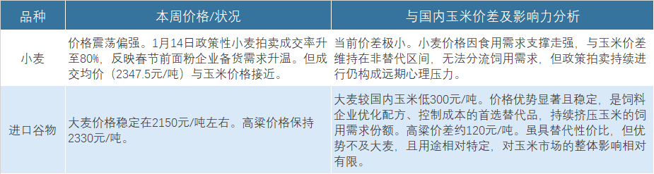1. 替代谷物:替代谷物市场呈现分化,小麦的饲用替代空间有限,而进口玉米和大麦的成本优势极为突出,持续压制国内玉米价格上限。