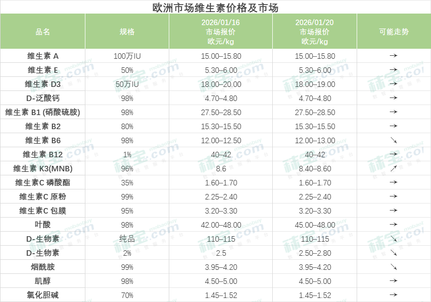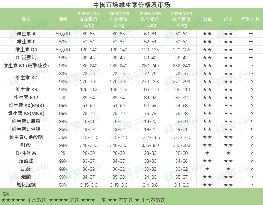 中国维生素市场整体较为稳定,实单交投清淡。维生素A主流大厂签单价格上调,下游保持观望,实际成交清淡,维生素A市场价格暂稳。维生素E厂家挺价意愿坚决,下游拿货更加谨慎,小单刚需成交为主,整体交投清淡,市场价格暂稳。泛酸钙、维生素B12市场成交偏淡,价格窄幅下调。烟酰胺工厂停报或上调报价,释放提价意向,市场询单活跃,主流价格稳中偏强运行。