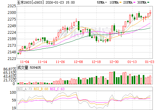 - 大连玉米期货主力C2603合约本周延续“高位震荡偏强”走势。周五收盘于2300元/吨,环比上涨0.83%。期价在现货市场坚挺的支撑下,整体运行于近一个月高位区间,同时,显示出在当前位置的多空均衡态势。
