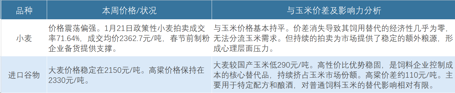 1. 替代谷物:替代谷物市场呈现“内外分化”格局。国内政策性小麦拍卖常态化,而进口谷物成本优势显著,持续影响饲用配方结构。
