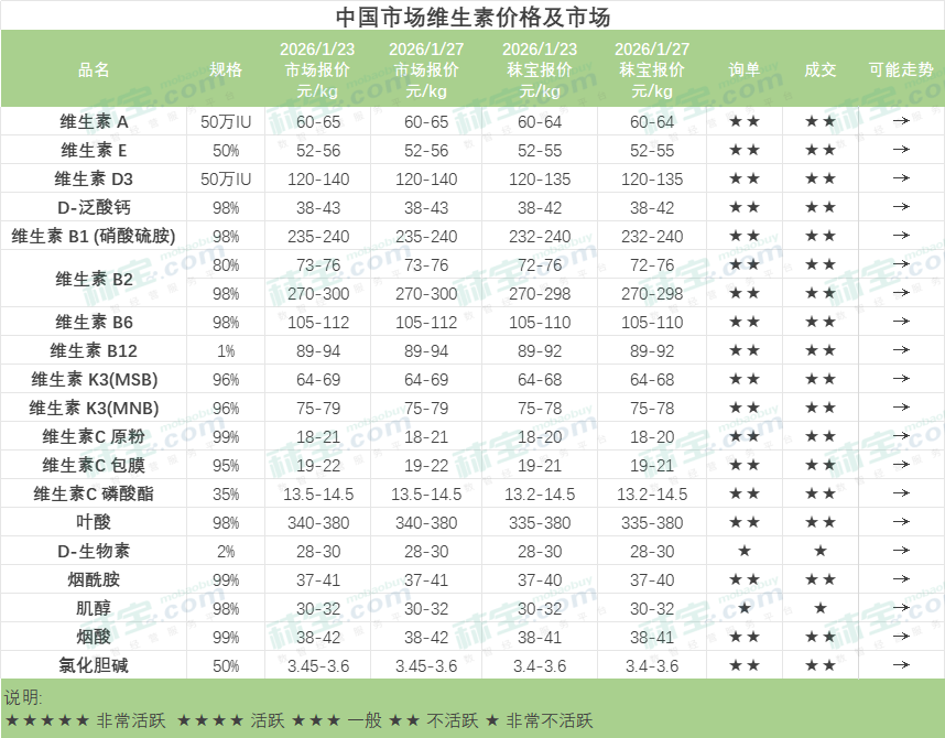中国维生素市场价格基本稳定,烟酰胺和维生素E询单积极,交投活跃。维生素A主流大厂停报,下游维持节前观望,整体成交清淡,市场价格暂稳。维生素E厂家提价挺价意愿较强,询单交投持续活跃,贸易渠道整体库存不高,价格暂稳运行。维生素B1市场消化库存为主,下游刚需采购,市场价格暂稳。烟酰胺工厂停报,市场询单交投活跃,现货供应较为紧张,市场价格目前稳定。