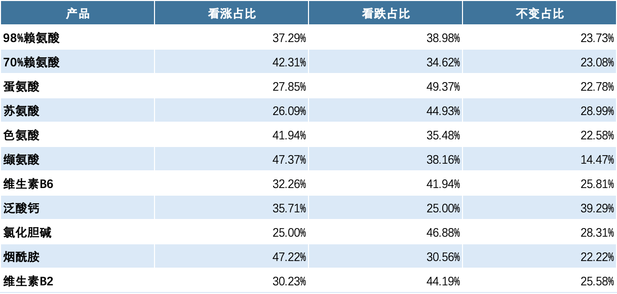 最近连续数周,秣宝网公众号用户对不同氨基酸和维生素产品后期涨跌的调查结果值得借鉴。