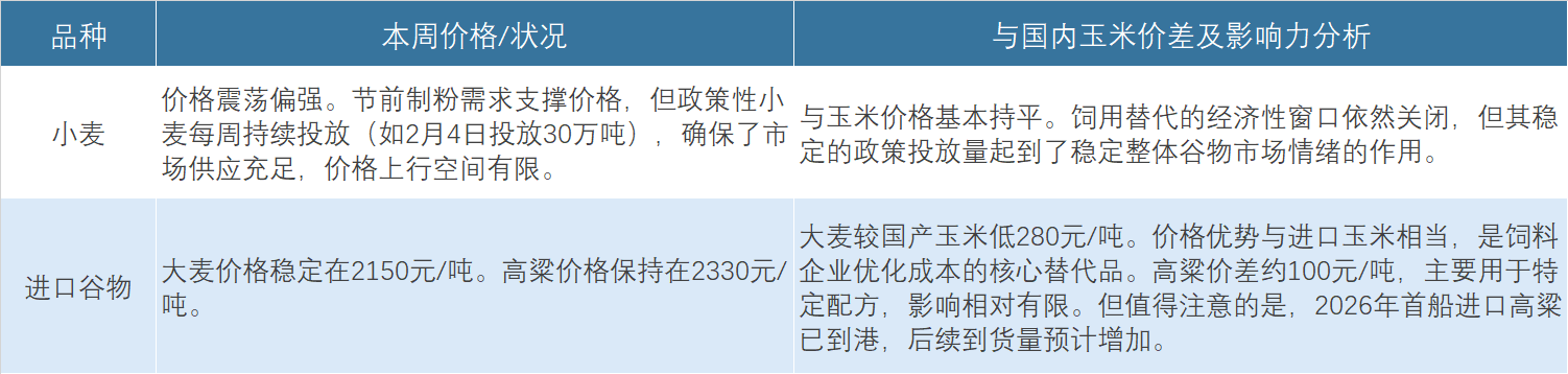 1. 替代谷物:替代谷物市场持续对国内玉米形成比价压力,尤其是进口谷物的价格优势,构成了国产玉米价格的明确“天花板”。