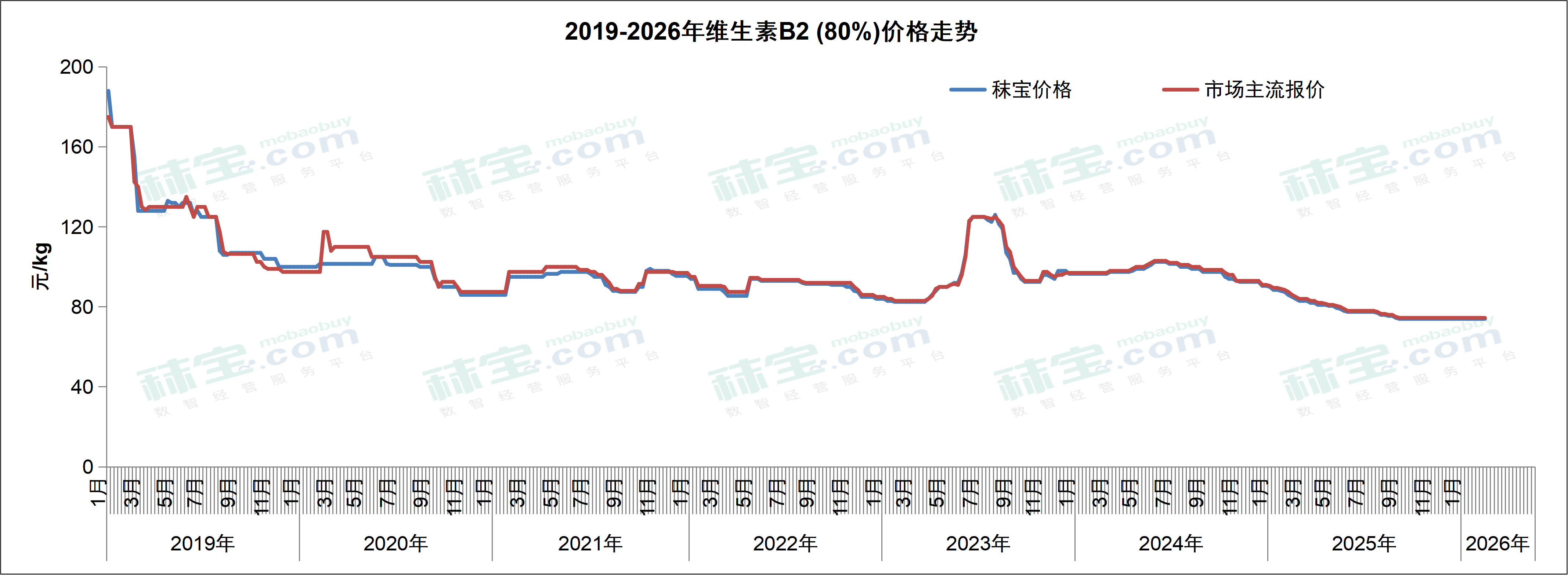 本周VB2 (80%) 市场主流价格73-76元/kg,VB2 (98%) 市场主流价格270-300元/kg。维生素B2市场库存充足,价格低位暂稳,终端维持刚需补货。