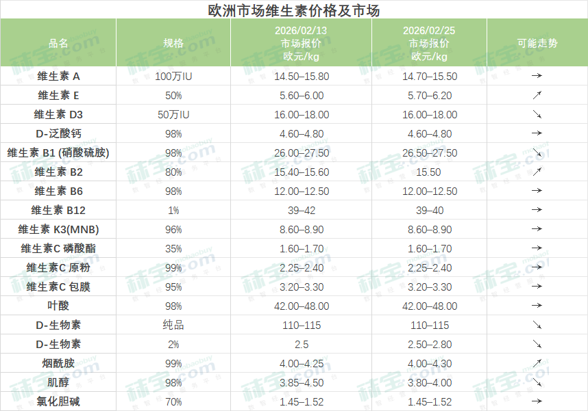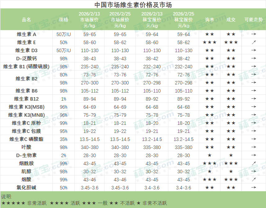 节后中国维生素市场暂时稳定,观望为主。维生素A主流大厂停报,下游维持观望心态,需求清淡,市场价格暂稳。维生素E主流厂家停报,挺价意愿较强,当前市场整体库存低位,询单相对积极,市场价格小幅偏强运行。烟酰胺部分厂家停报,成本端支撑较强,叠加现货供应偏紧,市场价格坚挺。