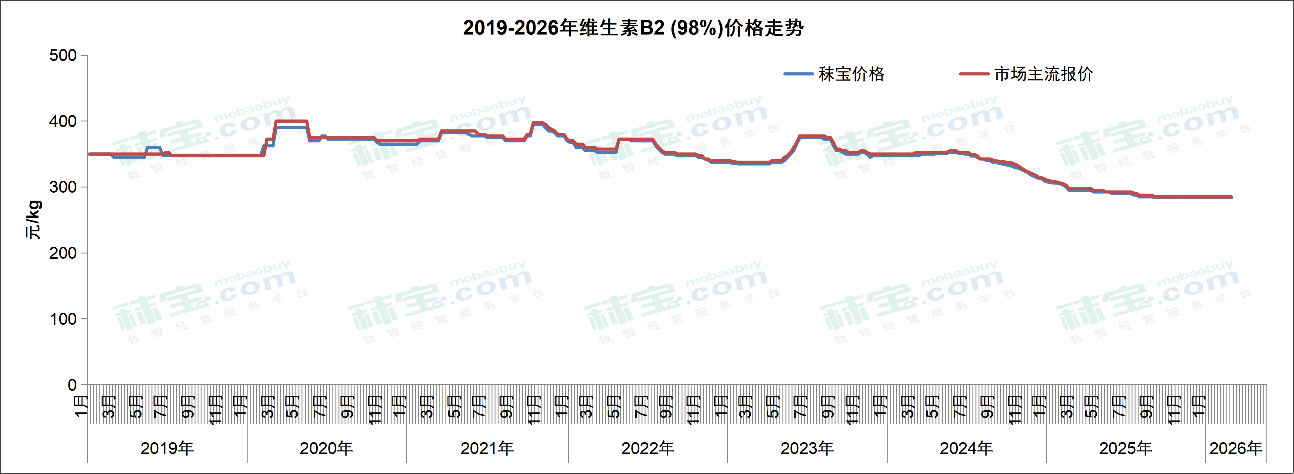 本周VB2 (80%) 市场主流价格73-76元/kg,VB2 (98%) 市场主流价格270-300元/kg。维生素B2市场库存充足,价格低位暂稳,终端维持刚需补货。