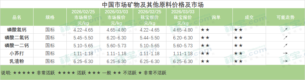 磷酸氢钙市场观望氛围为主,价格行情偏强运行。原料端:云南一主力酸企3月装置存在检修计划,硫酸价格表现坚挺,国际形势动荡,硫磺价格止跌反弹,总体来看,磷酸氢钙成本面支撑强势。供应端:磷酸氢钙部分主流厂家3月装置存在检修计划,市场供应量存在下滑预期。需求端:3月中旬左右,下游存在刚需补货预期。在多方利好因素交织下,预计短期内磷酸氢钙市场行情将偏强运行。