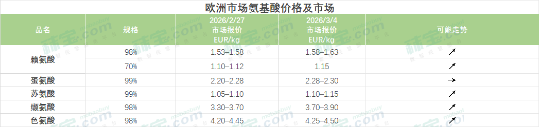 中国氨基酸市场赖氨酸、苏氨酸、色氨酸主流报价大幅上调;蛋氨酸厂家停报停签,惜售情绪较强;缬氨酸厂家报价暂时持稳。赖氨酸市场受中东地缘政治局势影响,多个厂家上调国内和出口报价,下游观望情绪浓厚,实际成交价格上涨。蛋氨酸市场工厂全线停报停签,惜售情绪较强,终端少量按需补库。苏氨酸市场厂家报价大涨,刺激市场购销情绪增强,贸易商和下游用户库存偏低。缬氨酸市场供应过剩,终端库存充足,实际价格稳中下调。色氨酸市场稳定运行,终端随采随用,实际成交一般。
