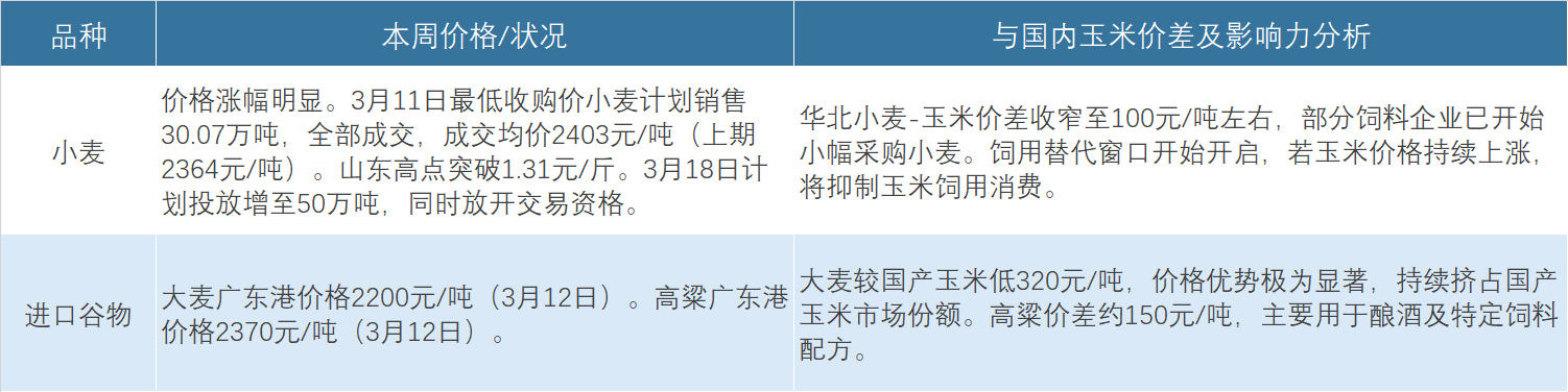 - 小麦替代窗口开启风险:华北小麦-玉米价差已收窄至100元/吨左右,部分饲料企业已开始小幅采购小麦。3月18日最低收购价小麦投放量将增至50万吨,同时放开交易资格,市场参与范围扩大。若小麦大规模进入饲料替代,将有效限制玉米的涨幅。