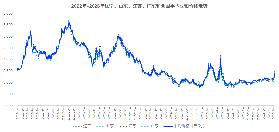 - 美伊冲突持续升级,霍尔木兹海峡航运近乎停滞,全球能源及大宗商品供应链受到严重冲击。原油价格暴涨直接推高了生物燃料需求预期及整体商品市场风险溢价,为豆粕价格提供了强劲的宏观和成本支撑。
