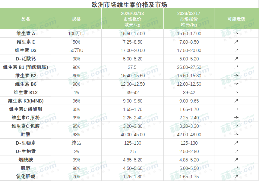 受持续地缘冲突影响,生产成本上升,中国维生素市场部分品类成交价格上行。维生素A有主流厂家维持停签停报,市场关注度提升,价格继续偏强。维生素E厂家挺价意愿较强,贸易渠道跟涨,VE价格大幅上行。维生素B1有主流厂家报价上调,市场价格暂稳。维生素K3主流厂家停报停签,贸易渠道报价偏强。烟酰胺厂家停报为主,市场价格坚挺趋强。生物素部分主流厂家停报,市场价格上涨。氯化胆碱受前端原料价格上涨影响,工厂报价上调,市场价格快速上涨。