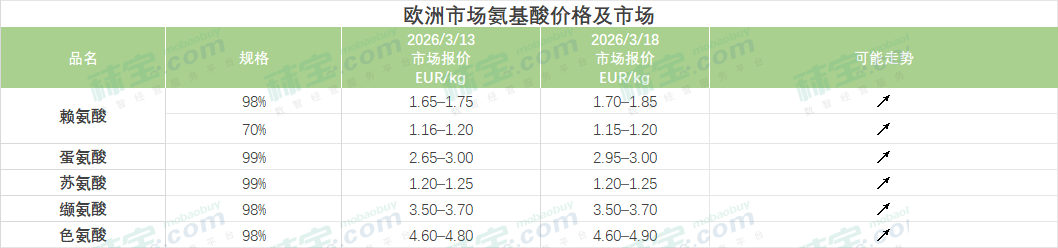 中国氨基酸市场各品类厂家报价继续上调,挺价惜售意愿强烈,下游用户对价格涨势保持观望,谨慎补货。赖氨酸市场因生产成本上涨,厂家提价情绪偏强,98.5%赖氨酸盐酸盐出口量增大,终端采买谨慎,市场成交一般。蛋氨酸市场厂家大多停报,等待头部企业最新报价,惜售看涨情绪浓厚。苏氨酸市场厂家继续提价,出口大幅上涨,贸易商和下游用户库存低位,市场购销情绪较高。缬氨酸市场厂家因煤炭等原料涨价继续上调报价,终端用户按需补库。色氨酸市场供需紧平衡,部分工厂停报,终端大多随采随用。