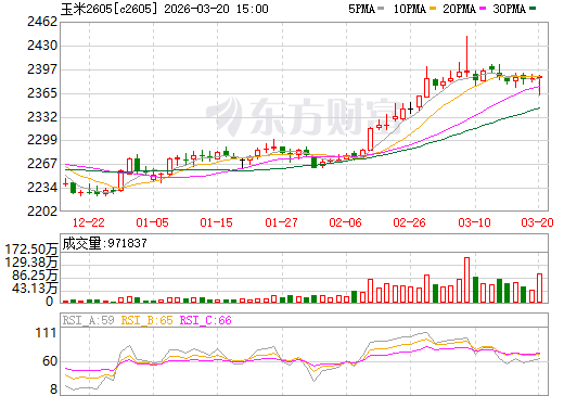 - 大连玉米期货主力C2605合约本周呈现“高位震荡、2400关口博弈激烈”的格局。本周五收盘于2387元/吨,较上周五微涨1元,环比上升0.04%,成交971837手,持仓1316707手。成交量较上周有所放大,持仓量小幅回落,资金观望情绪浓厚。