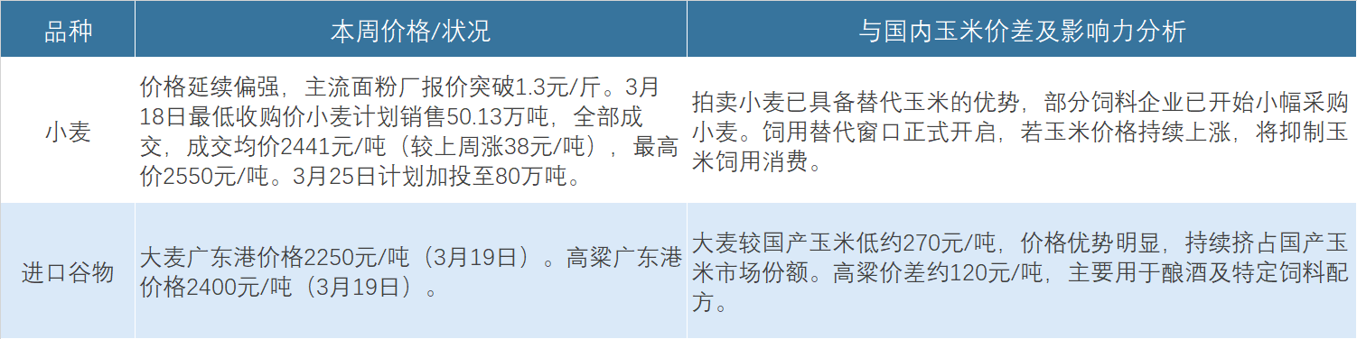 - 小麦替代超预期风险:3月25日托市小麦投放量将增至80万吨,若成交持续火爆,小麦大规模进入饲料替代,将有效限制玉米涨幅。