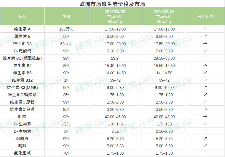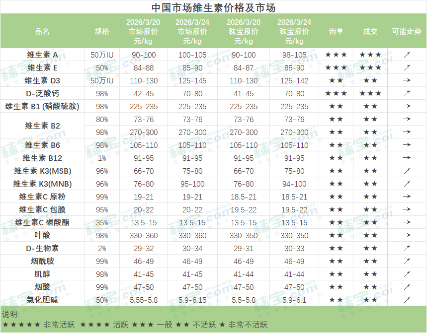 受地缘冲突影响,中国维生素市场部分品类价格延续涨势,下游询单活跃。维生素A贸易渠道现货库存紧张,惜售推涨情绪浓,询单积极,市场价格延续涨势。维生素E厂家挺价意愿较强,市场库存有限,询单相对活跃,VE价格缓慢上行。泛酸钙厂家报价上调或停报,市场价格暴涨。维生素B1有主流厂家停报停签,市场价格暂稳。维生素B2、B6、B12有厂家上调报价,市场行情暂稳。氯化胆碱原料价格上涨,工厂报价上调,市场价格大幅偏强调整。另据海关进出口数据显示,2026年1月维生素出口量同比增长15.81%,环比下降2.89%;2月维生素出口总量同比增长13.73%,环比下降26.63%。