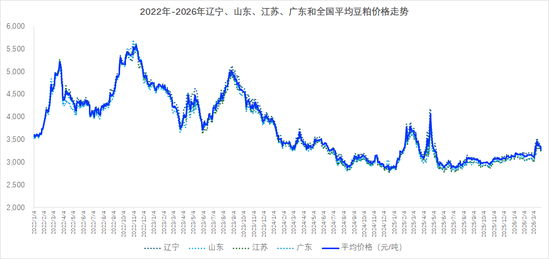 - 现货价格:本周国内豆粕现货价格弱势下跌。周五全国平均价格为3267元/吨,环比明显回落下跌3.20%,但同比上涨4.18%,仍处于近一年相对高位。区域报价方面,3月26日天津地区3260元/吨、江苏地区3190元/吨、广东地区3270元/吨,现货基差维持在M05+258至M05+338之间。