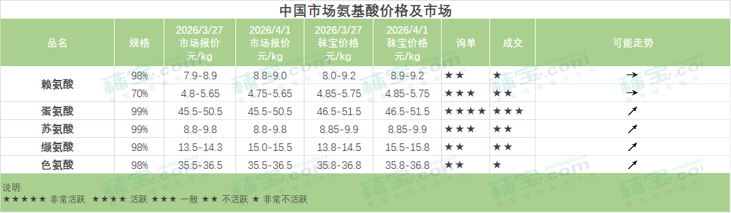 出口表现较好,厂家报价上调,国内终端询单一般,随用随采。据市场消息称,3月30日,华恒生物宣布即日起,其饲料级缬氨酸报价16000元每吨起。后续需关注厂家报价变化和实际成交情况。预计短期内缬氨酸价格或持稳运行。