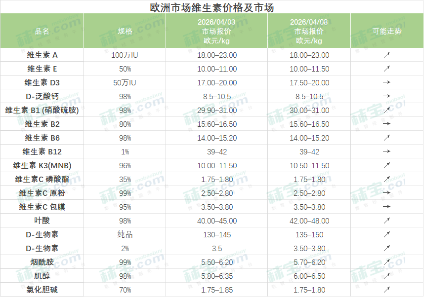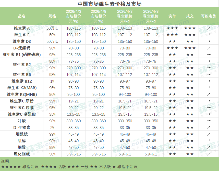 中国维生素市场部分品类询单交投活跃,厂家挺价为主。维生素A生产原料价格上涨,厂家挺价心态强烈,市场价格保持坚挺。维生素E主流厂家挺价意愿较强,贸易渠道询单交投活跃,VE市场价格坚挺。维生素B12有厂家上调报价,市场行情暂稳。叶酸有主流厂家提价,下游需求成交一般,市场价格暂稳。氯化胆碱原料供应紧张,工厂搭配发货,市场价格坚挺。其他品类基本维持价格稳定,购销氛围一般。