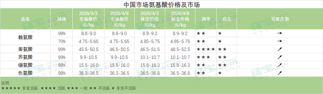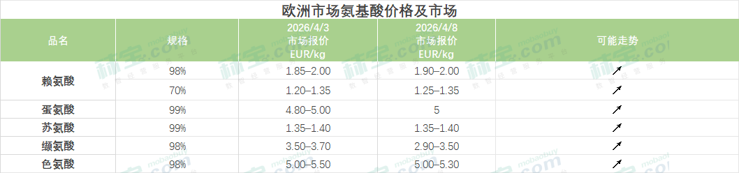 中国氨基酸市场赖氨酸、苏氨酸、缬氨酸主流报价持稳,色氨酸和蛋氨酸厂家报价略涨。赖氨酸市场厂家出口报价继续上调,国内节后市场交投氛围偏淡,下游用户维持按需随用随采。蛋氨酸市场主流厂家和贸易渠道报价均略有上涨,下游用户当前库存充足,询单交投偏弱。苏氨酸市场厂家出口较好,出口报价涨至1310-1330美元/吨,下游用户谨慎按需补货。缬氨酸市场观望氛围浓郁,终端维持刚需采买。色氨酸市场现货供应偏紧,刺激询单氛围好转,终端少量补货。
