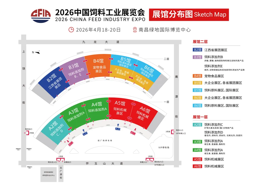 2026中国饲料工业展览会由中国饲料工业协会主办,将于2026年4月18日–20日在江西南昌绿地国际博览中心隆重开幕。本届展会规模宏大,共使用10个展馆(A2–A6馆;B2–B6馆),展览总面积超过10万平方米,预计逾千家企业参展,为业内人士开展沟通合作提供了理想平台。