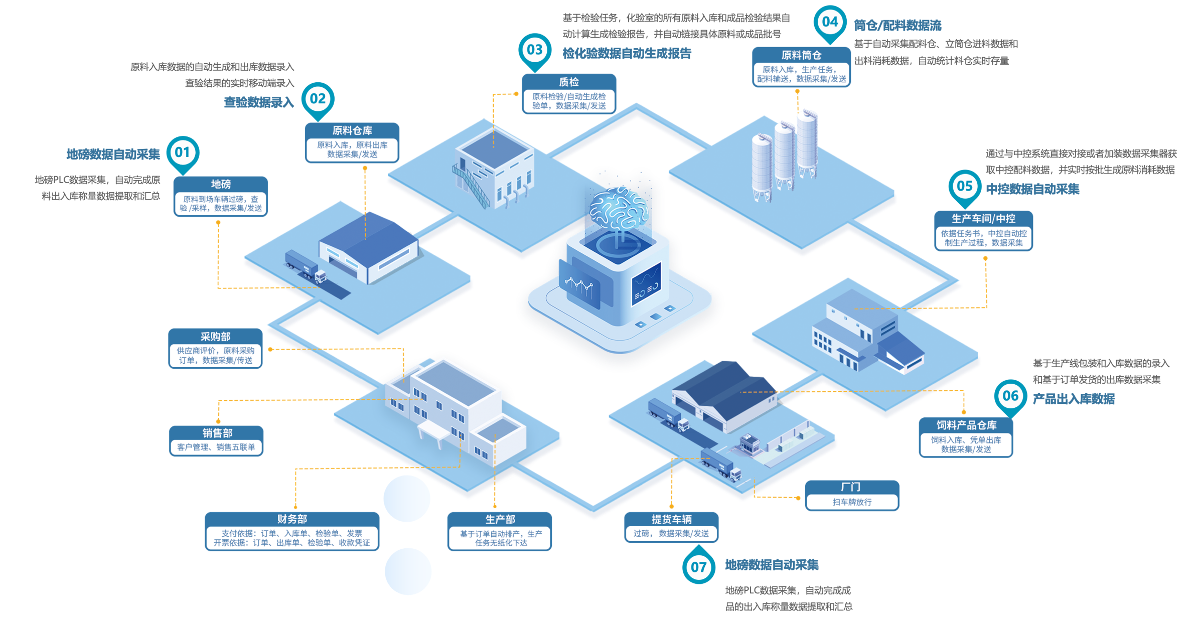 融合互联网技术、数字技术与AI技术,覆盖采购、库管、配方、生产、销售、质量、设备及合规等全流程全周期,帮助饲料生产企业应对不同业务场景并贯通各个生产环节数据,高效实现管理优化和降本增效。